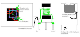 O transformador de FI é construído aproveitando as formas já prontas que podem ser encontradas facilmente em receptores de FM danificados de onde tiramos o enrolamento existente e com fio fino esmaltado enrolamos 14 espiras sobre o pequeno núcleo de ferrite da forma. Primeiramente retiramos a blindagem de metal, depois do enrolamento feito soldamos as pontas do fio nos terminais (os dois de fora do lado que tem 3 pinos) e está pronto o nosso transformador de FI. Se no interior desta forma você encontrar um pequeno capacitor, não esqueça de remove-lo. O capacitor *CB é um cerâmico de 47pf.