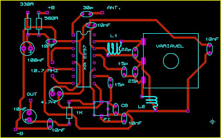 Abaixo temos o designe da placa de circuito impresso deste receptor, sendo mostrado primeiro o lado dos componentes e depois o lado do impresso.